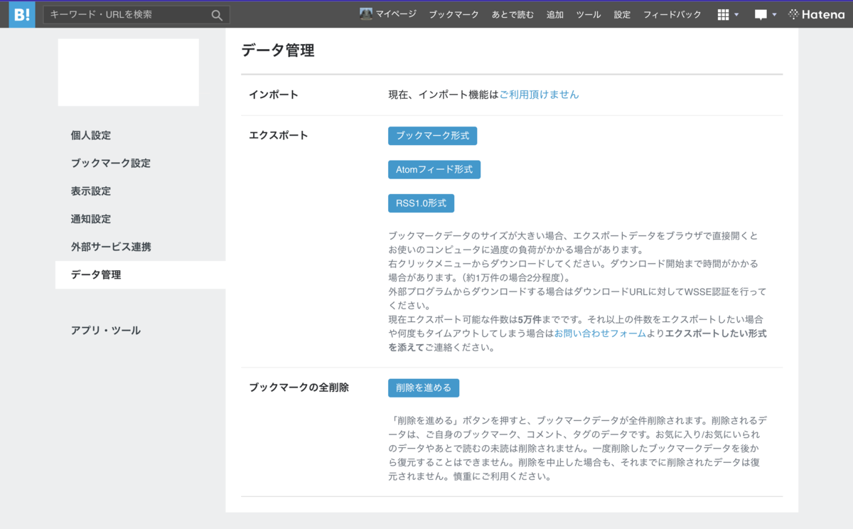 上部のメニューの「設定」をクリックすると、左側にメニューが出てくるので、「データ管理」をクリックするとエクスポートの画面が出てきます。今回は「ブックマーク形式」をクリックして、ブックマークのデータをデスクトップなどに保存します。