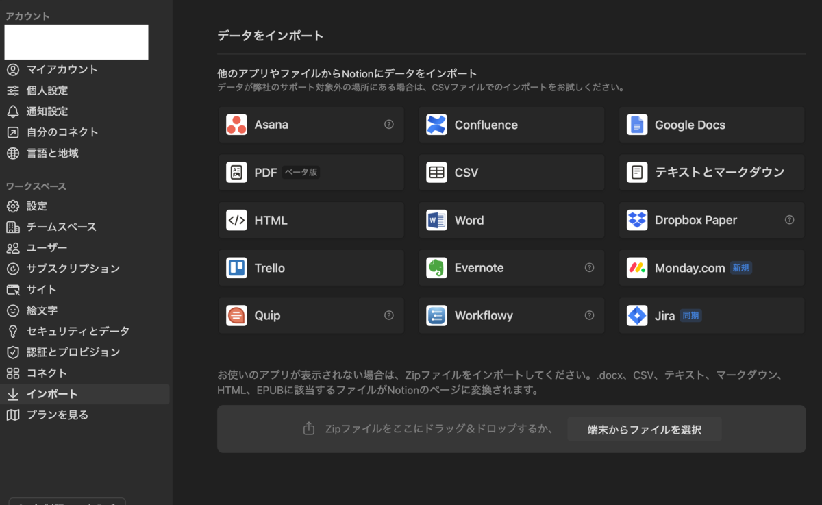 Notionに取り込むときはNotionの「設定」から「インポート」アクセスすることで、以下のような画面が出てきます。