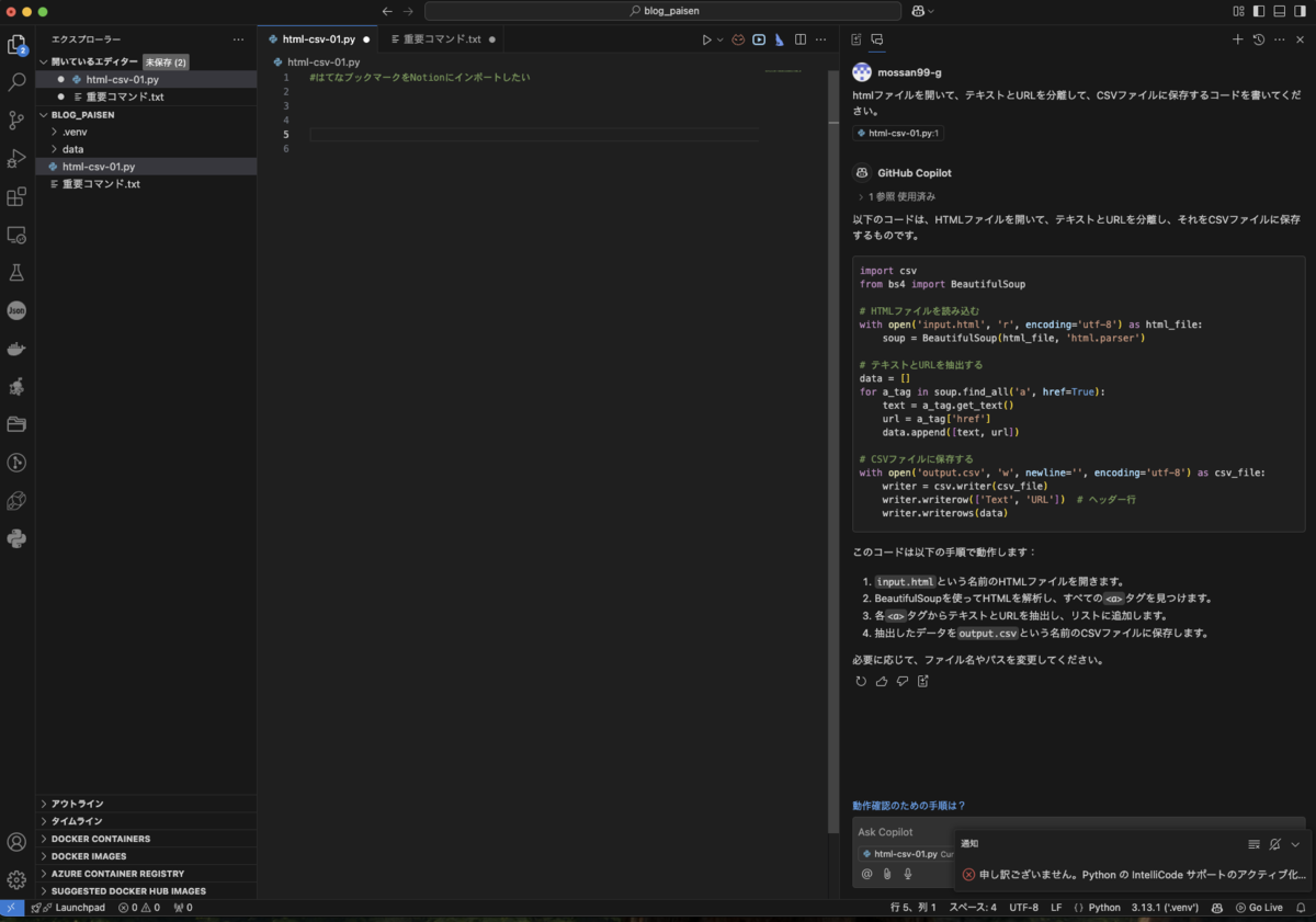 色々調べた結果、Pythonを使えばこのような変換ができることがわかりました。ここでようやくAIパイセンの出番です。VSCodeの設定とか仮想環境とかの説明も必要なんですが、それはまた別の記事で書いてみようと思います。とりあえず準備をして、GitHub Copilotに質問です。以下のように聞いてみました。